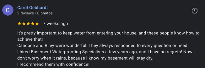 I hired Basement Waterproofing Specialists a few years ago, and I have no regrets! Now I don’t worry when it rains, because I know my basement will stay dry. I recommend them with confidence!
